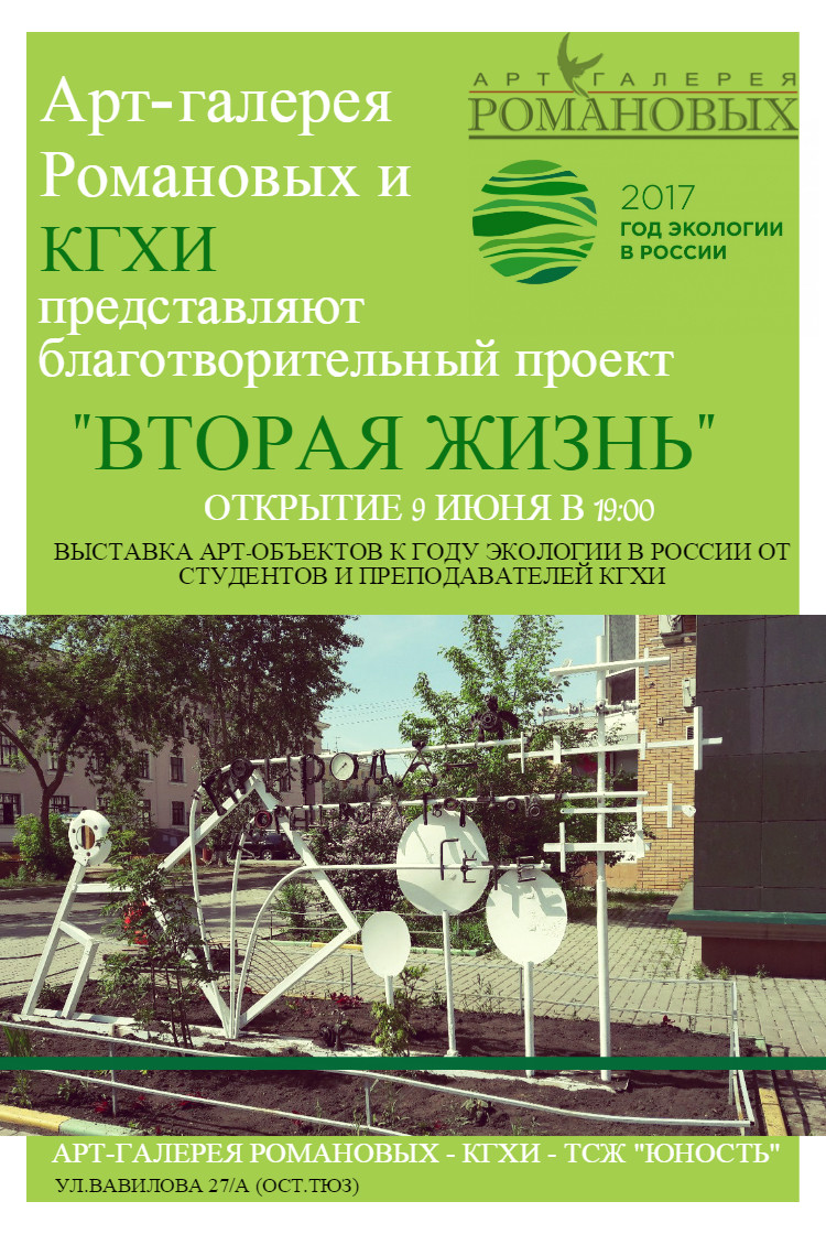 Выставка-проект «Вторая  жизнь» приурочена к Году экологии в России. Ее цель  - демонстрация арт-объектов из вторичных материалов, которые получили вторую жизнь в виде произведений искусства, вместо того, чтобы оказаться выброшенными и загрязнять окружающую среду.